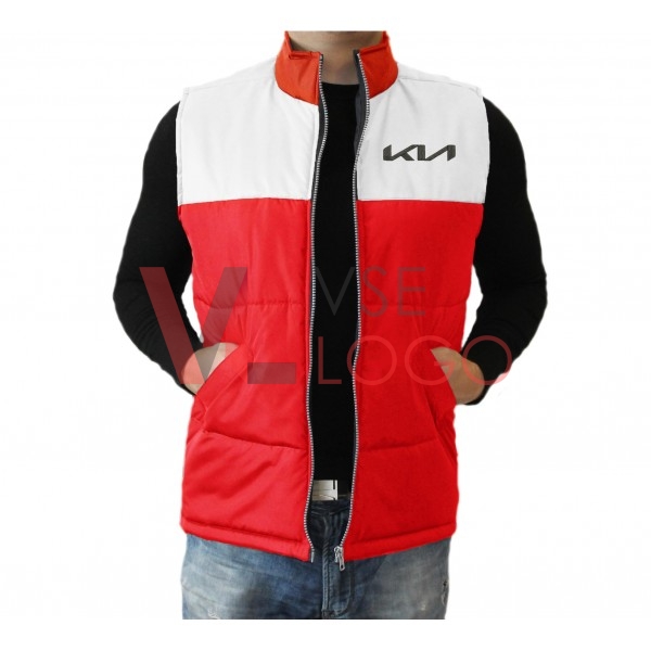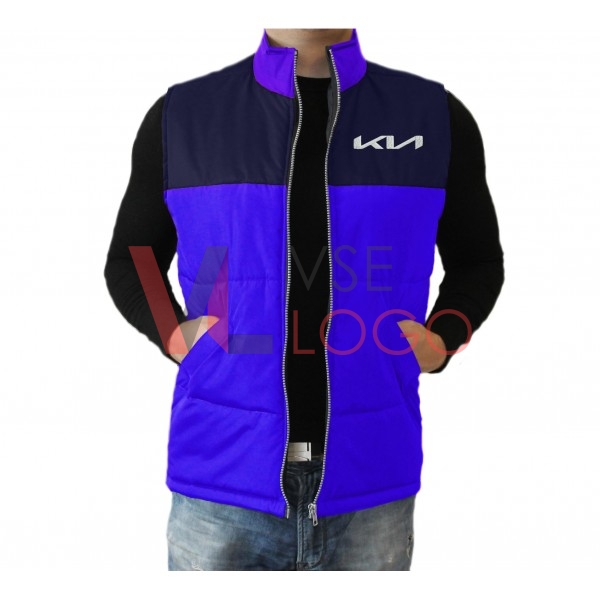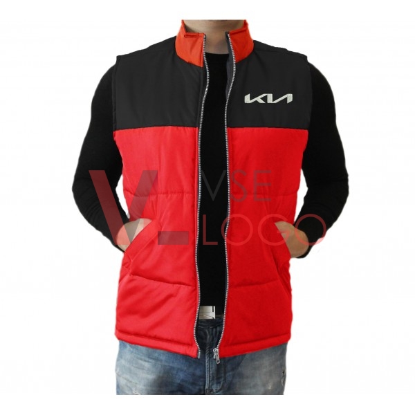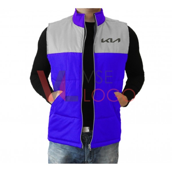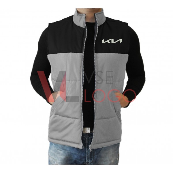 Комбинированный по цвету утепленный жилет с воротником-стойкой, застежкой на молнию, дополненный двумя внешними и одним внутренним карманом.